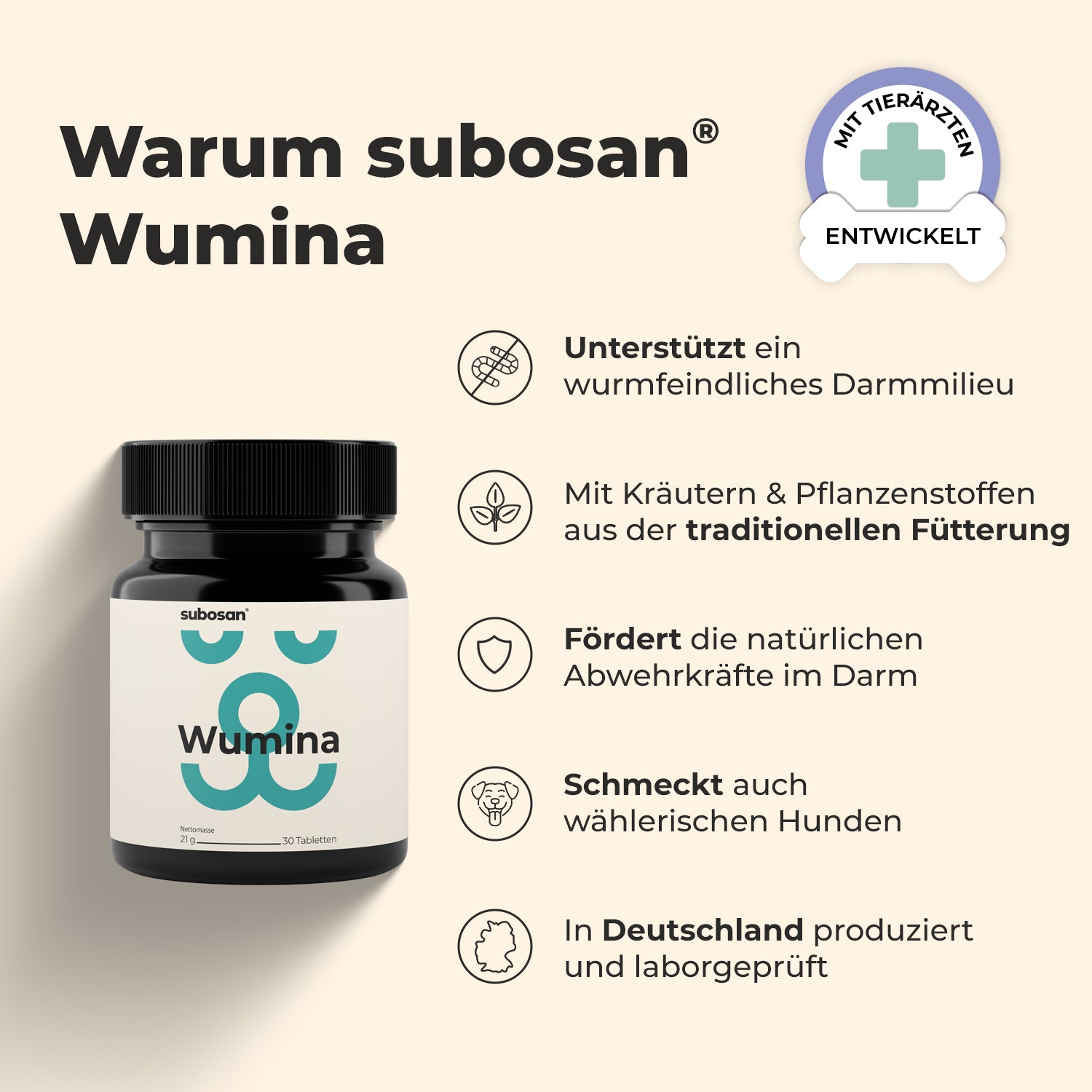 subosan® Wumina ist ein natürliches Ergänzungsfuttermittel – kein chemisches Wurmmittel (Anthelminthikum). Die Rezeptur wirkt sekundär, indem sie das Darmmilieu unterstützt und so ein Umfeld schafft, das für ungebetene Gäste weniger attraktiv ist.
