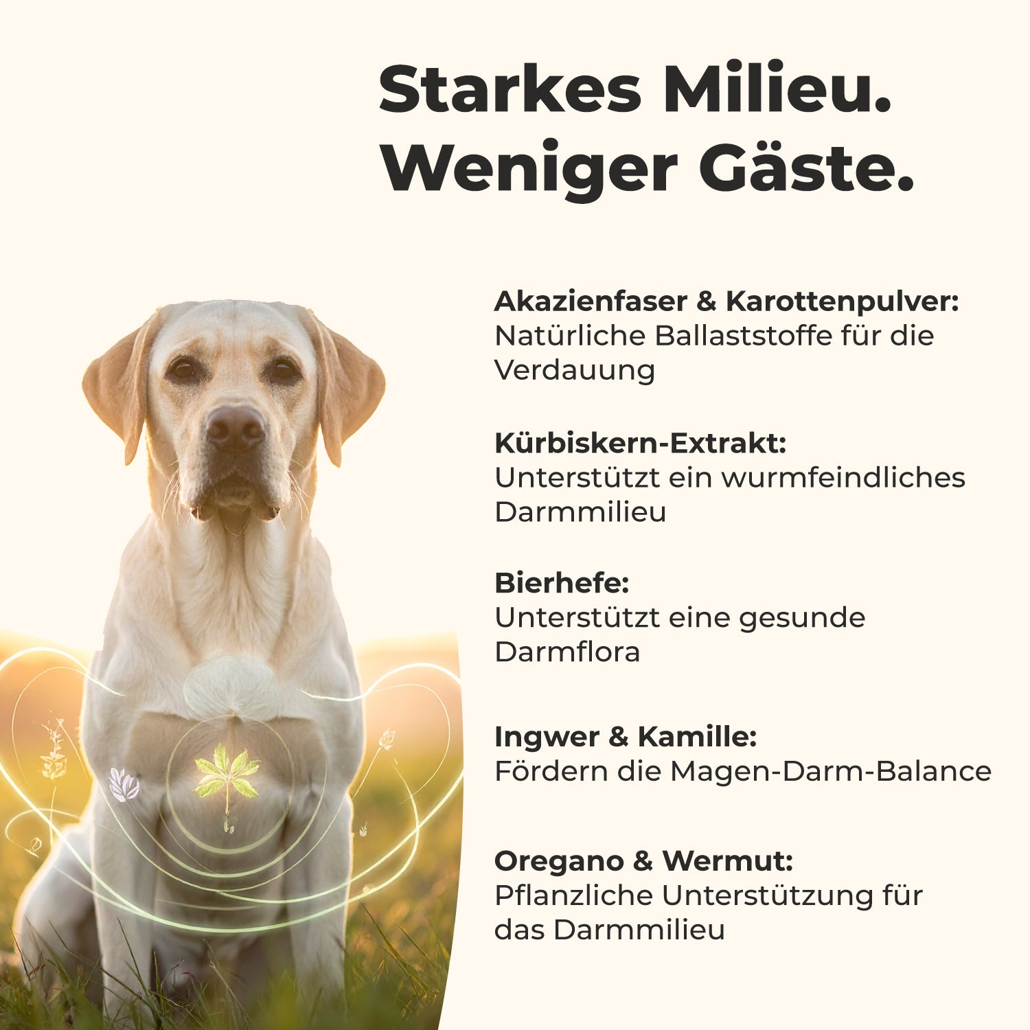 Jede Tablette enthält sorgfältig abgestimmte Pflanzenstoffe und natürliche Begleiter, die das Darmmilieu unterstützen und das Wohlbefinden deines Hundes fördern. Sanft und ohne Chemie.